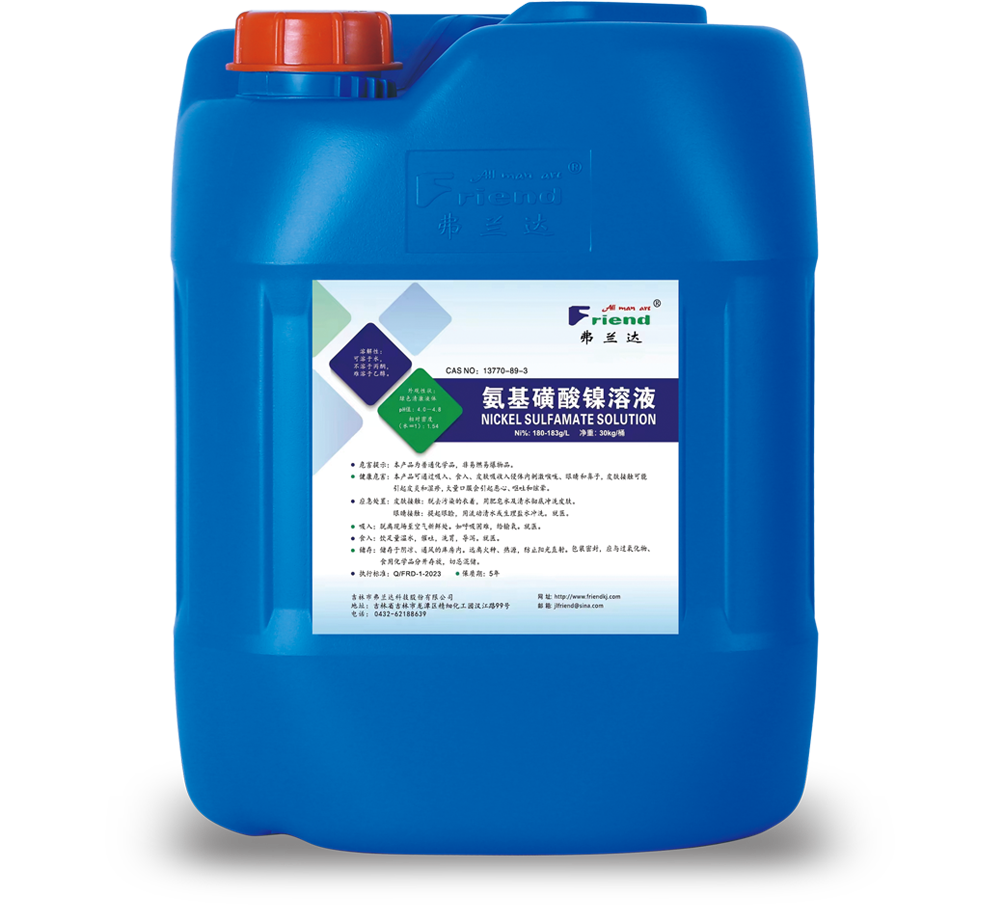 吉林市弗蘭達科技股份有限公司成立于2004年,位于吉林省吉林市龍潭經濟開發區精細化工園漢江路99號,注冊資本1000萬元,占地2萬平方米。專業從事醋酸鎳、氨基磺酸鎳、堿式碳酸鎳、氨基磺酸鈷等系列產品的研發與生產。產品均通過歐盟Reach和Rohs認證,生產制造過程通過了ISO9001質量管理和ISO14001環境管理體系認證,擁有自主進出口經營權。本著追求卓越、回報社會的企業宗旨,本著誠信擔當、品質卓越、激情創新、和諧共贏的核心價值觀,為客戶提供優質服務,做行業知名品牌。產品主要應用領域:鋁合金陽極氧化、著色、封閉劑行業;精密電鍍、電子電鍍行業;石油化工、機械行業的催化劑制造、電鍍主鹽等。